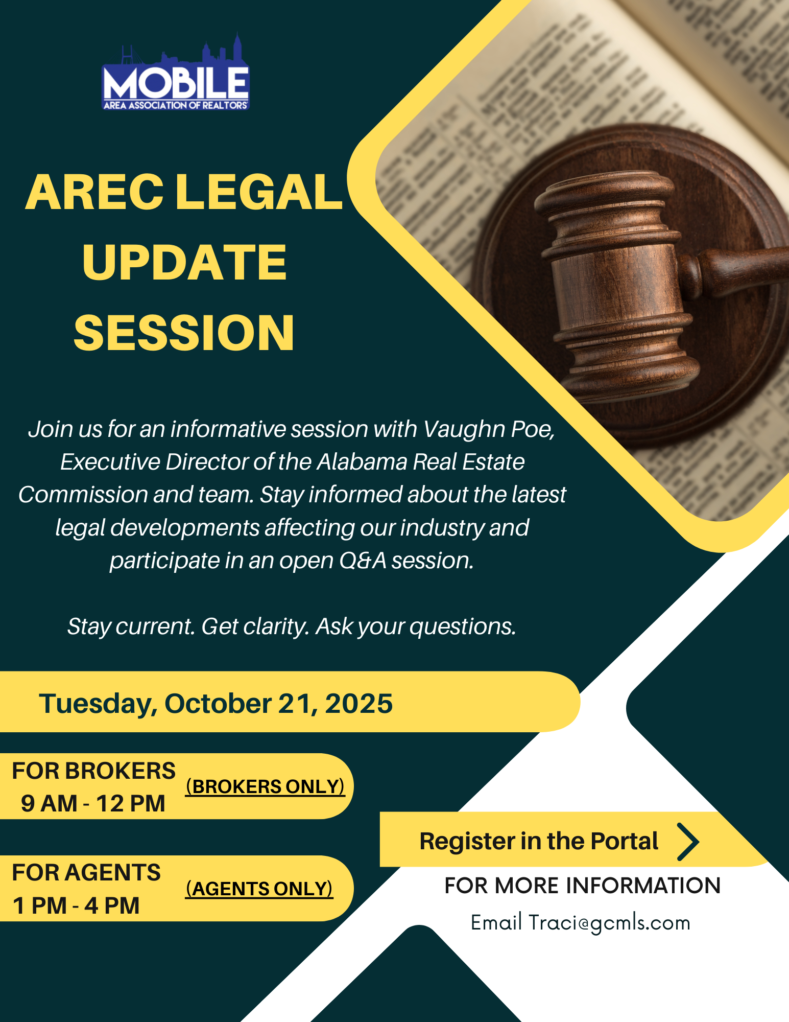 October 21, 2025 Alabama Real Estate Commission Legal Update Session Event Date: October 21, 2025 Event Time: Brokers 9 AM - 12 PM Agents 1 PM - 4 PM Register Here!